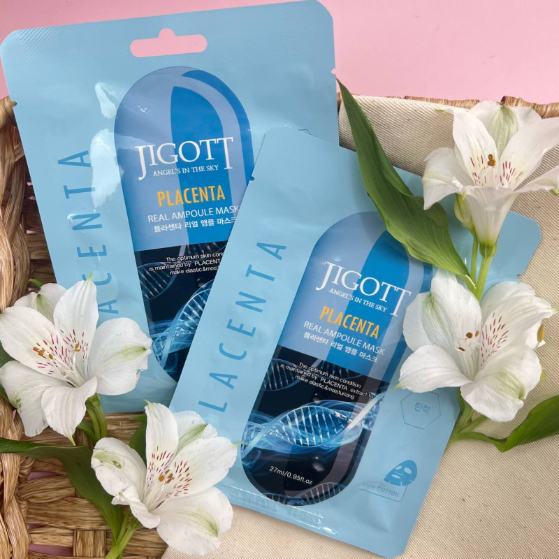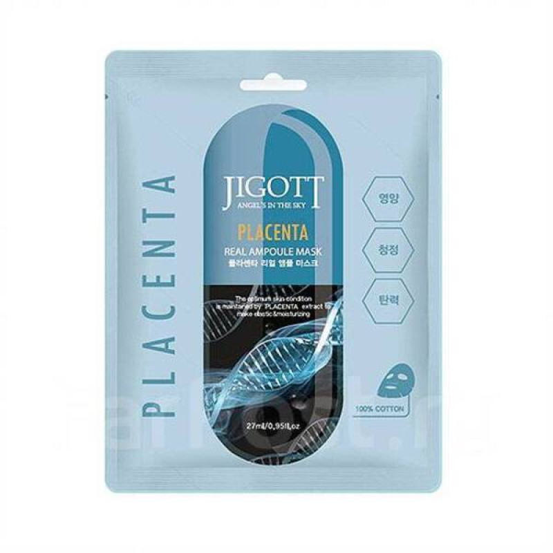 Ампульная маска Jigott Placenta Real Ampoule Mask обогащена формулой на основе фитоплаценты соевых бобов, которые заполняет кожу влагой. Благодаря в составе плацентной вытяжки маска обладает двойным эффектом, который создает защитный барьер и повышает кровообращение в коже. В маске есть гиалуроновая кислота, которая обеспечивает глубокое увлажнение и восстановление. Экстракт красного женьшеня, который способствует заживлению, разглаживанию морщин и выравниванию тона лица. Витамин Е улучшает цвет лица, помогает выводить токсины и сохранять влагу в коже. Маска борется со складками и небольшими морщинами, благодаря улучшению циркуляции в коже. Маска изготовлена из чистого хлопка, который плотно притягивает ко всему лицу и подходит даже к чувствительной коже. Ампульная маска от Jigott идеально подходит для интенсивного увлажнения, питания и обновления кожи, придавая ей свежесть и здоровый вид.