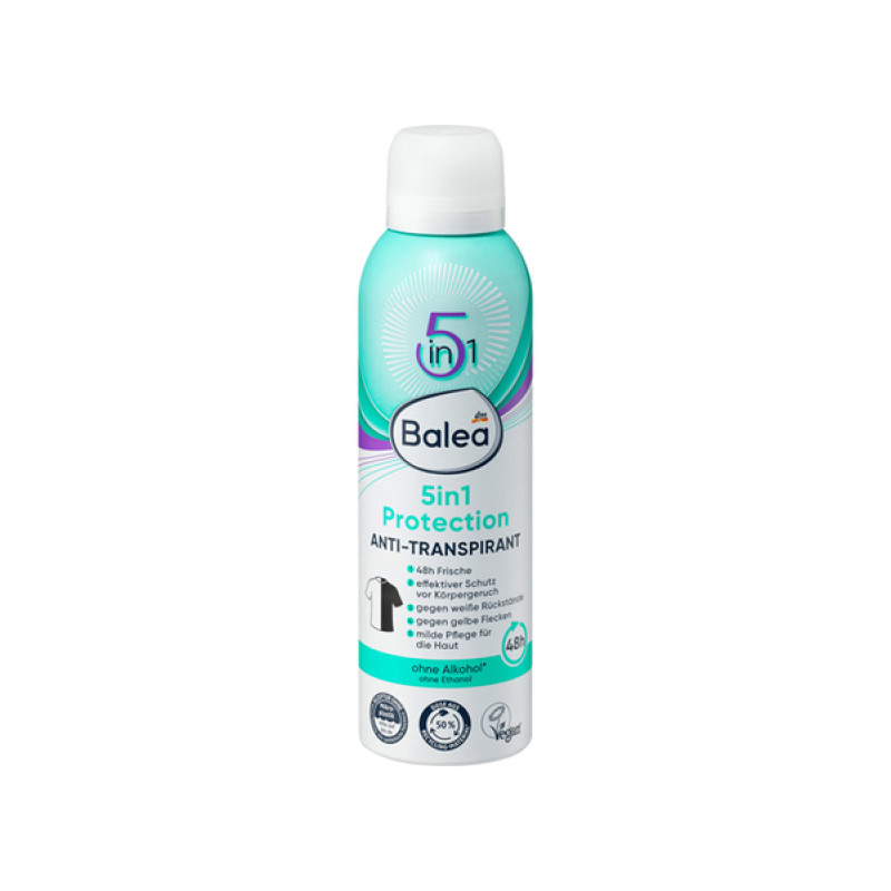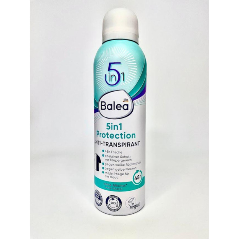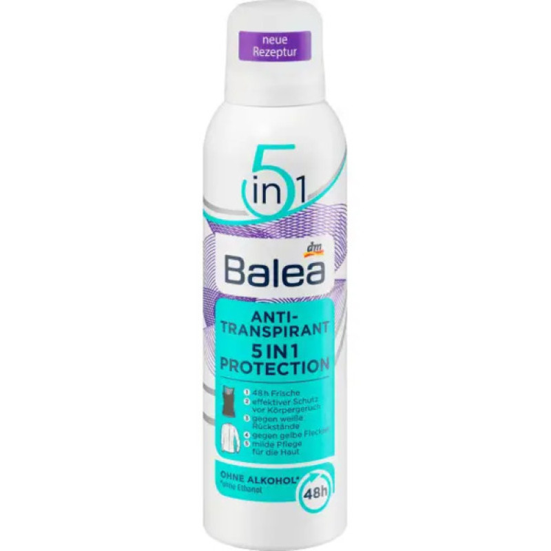 Антиперспирант Balea Защита 5в1 - обеспечивает ощущение сухости, не оставляет белых и желтых пятен на одежде. Его формула может поддерживать свежесть до 48 часов, обладает фруктово-цветочным ароматом. Средство не содержит спирта, что делает его нежным к коже. Антиперспирант обеспечивает длительное ощущение свежести, чистоты, эффективно устраняет неприятные запахи и тонизирует кожу. Средство от Balea предотвращает раздражение и покраснение, а также повышает укрепление естественного защитного барьера кожи, за счет борьбы с патогенными микроорганизмами.