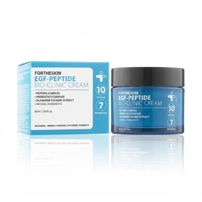 Антивозрастной крем для лица Fortheskin Egf-Peptide Bio-Clinic Cream представляет собой высокотехнологичный продукт от бренда Fortheskin, созданный для эффективной борьбы с возрастными изменениями на клеточном уровне. Данный антивозрастной крем идеально подходит для зрелой кожи, склонной к дряблости, потере четкости овала лица и появлению морщин. Благодаря синергии EGF (фактора роста) и пептидного комплекса, средство запускает процессы естественной регенерации, буквально «пробуждая» клетки кожи. Крем интенсивно питает, глубоко увлажняет и разглаживает кожные заломы, работая над плотностью и тургором. При регулярном использовании лицо приобретает свежий, отдохнувший вид, а мелкие и средние морщины становятся менее выраженными.