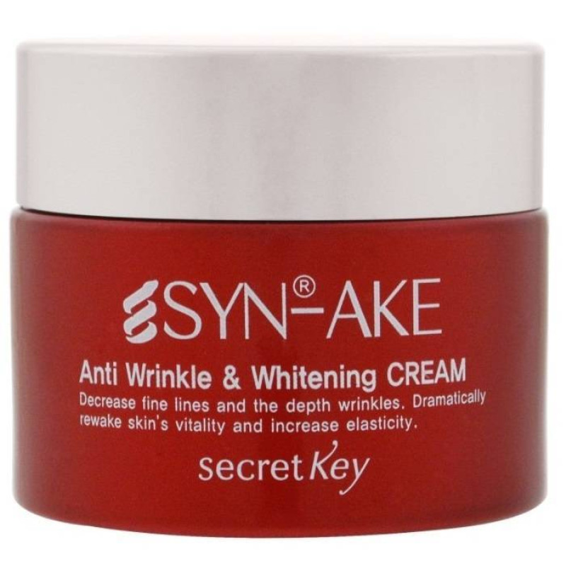 Крем для возрастной кожи SYN-AKE Anti Wrinkle&Whitening Cream обладает замечательным омолаживающим эффектом, уменьшает морщинки, придает коже гладкости и ровности. Благодаря пептидам и змеиному яду в составе средства, устраняются глубокие морщинки, активно увлажняются клетки эпидермиса, разглаживается микрорельеф дермы. Syn-Ake – это синтетическое вещество, созданное в качестве аналога змеиного яда. Данный пептид замораживает мышцы, вызывающие морщинки, тем самым замедляет возрастные изменения. Крем с высоким содержанием растительных компонентов (аденозина, витамина Е, алоэ-вера,масла ши и вытяжки икры) гарантирует уменьшение морщин, расслабление лицевых мышц, интенсивно увлажняет клетки, напитывает их кислородом, улучшает клеточную регенерацию и повышает защитные функции дермы.