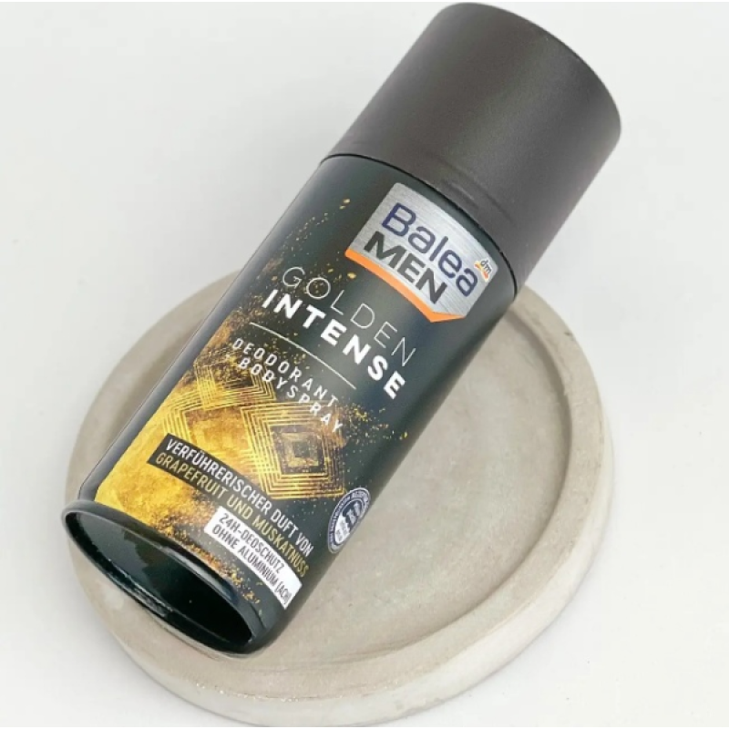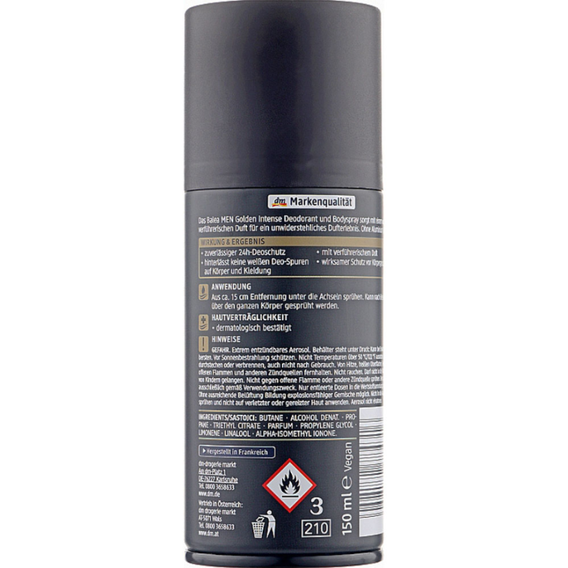 Дезодорант-спрей Men Golden Intense Deodorant - поможет приятно пахнуть и безупречно выглядеть во время важной встречи или интенсивной тренировки. Средство обеспечит 24-часовую защиту от неприятного запаха, не пересушит кожу и позволит ей дышать. Дезодорант защищает от бактерий, вызывающих запах пота. В составе есть антибактериальный комплекс, который мгновенно реагирует на пот, нейтрализует бактерии и предотвращает появление запаха и раздражений. Гипоаллергенный состав подходит для всех типов кожи. Не оставляет следов на одежде и быстро высыхает. Средство от Balea удобный спрей, который позволяет равномерно наносить средство без перерасхода.