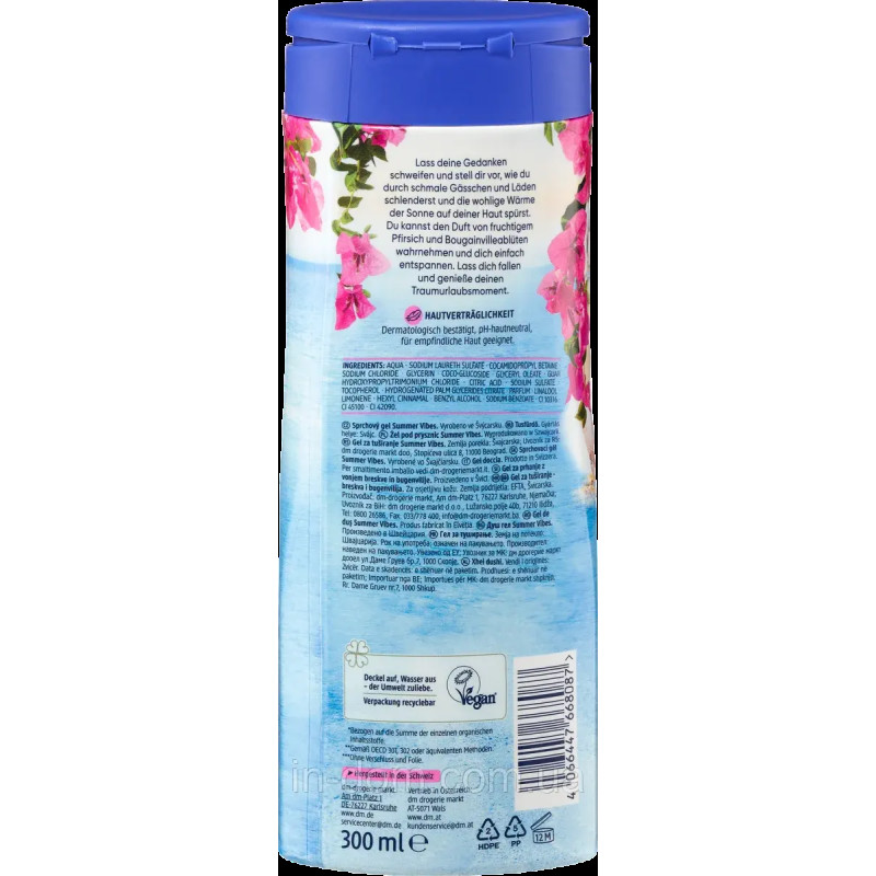 Гель для душа Summer Vibes идеальный вариант, кто хочет ощутить летнее настроение в своей повседневной жизни. Средство наполнено освежающим фруктово-цветочным ароматом, который посещение душа делает настоящим удовольствием. В составе есть увлажняющая формула, которая бережно очищает кожу, делая ее мягкой, ухоженной и свежей. Гель для душа имеет легкую структуру, которая хорошо пенится и обеспечивает деликатное очищение. Гель делает кожу увлажненной и предотвращает пересушивание. Средство дарит долгое ощущение свежести после пользования. В составе есть 99% биоразлагаемых компонентов, что делает их экологически безопасными. Гель идеально подойдет для ежедневного пользования. Средство от Balea будет ежедневным напоминанием о теплом лете, которое обеспечит комфорт и заботу о коже.