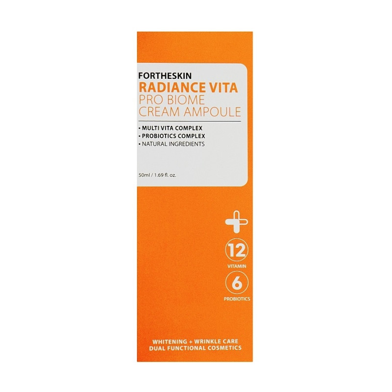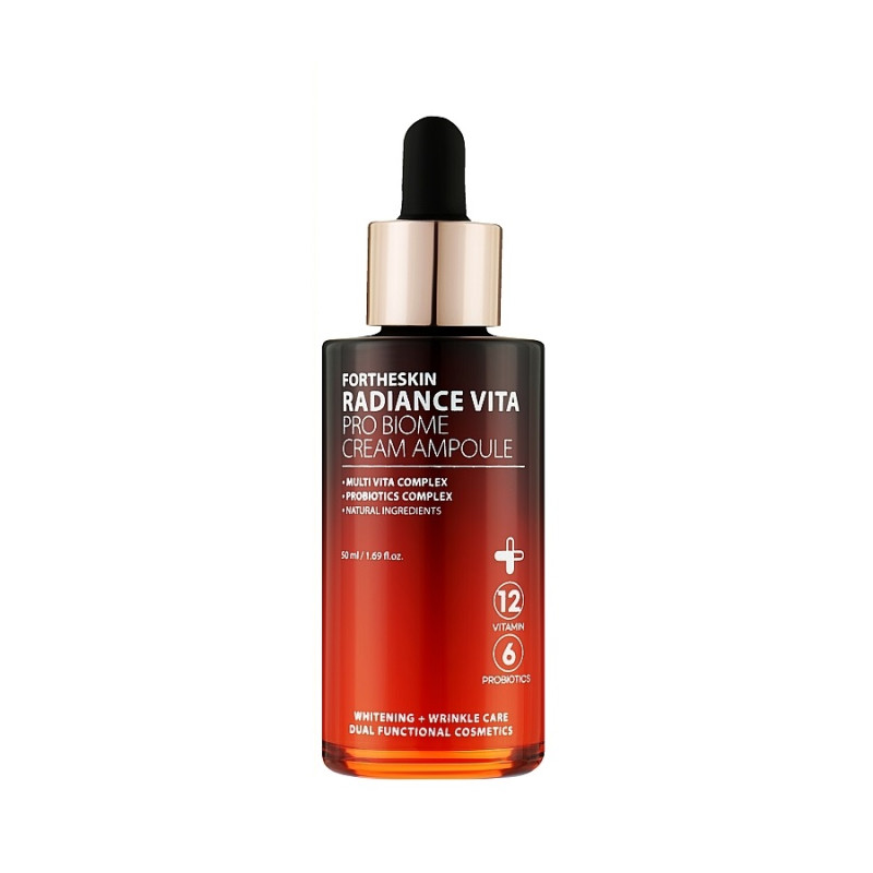 Крем-сыворотка для лица с эффектом лифтинга Fortheskin Radiance Vita Pro Biome Cream Ampoule с 2% ниацинамидом сочетает в себе мощное выравнивание тона кожи с глубоким питанием и укреплением естественной защиты. Легкая шелковистая формула, обогащенная каприловыми триглицеридами, цетеариловыми оливатами и диметиконом, удерживает влагу и придает коже мягкость.