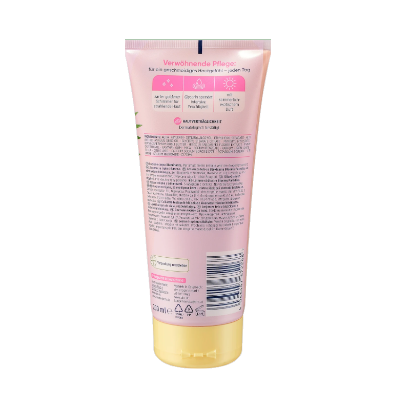 Лосьон для тела Balea Bloomy Paradise Body Lotion сочетает в себе эффективное увлажнение, питание и уход благодаря комплексу натуральных масел, экстрактов и активных компонентов. Он помогает поддерживать оптимальный уровень влаги, делает кожу мягкой и эластичной, а также придает ей нежное сияние.