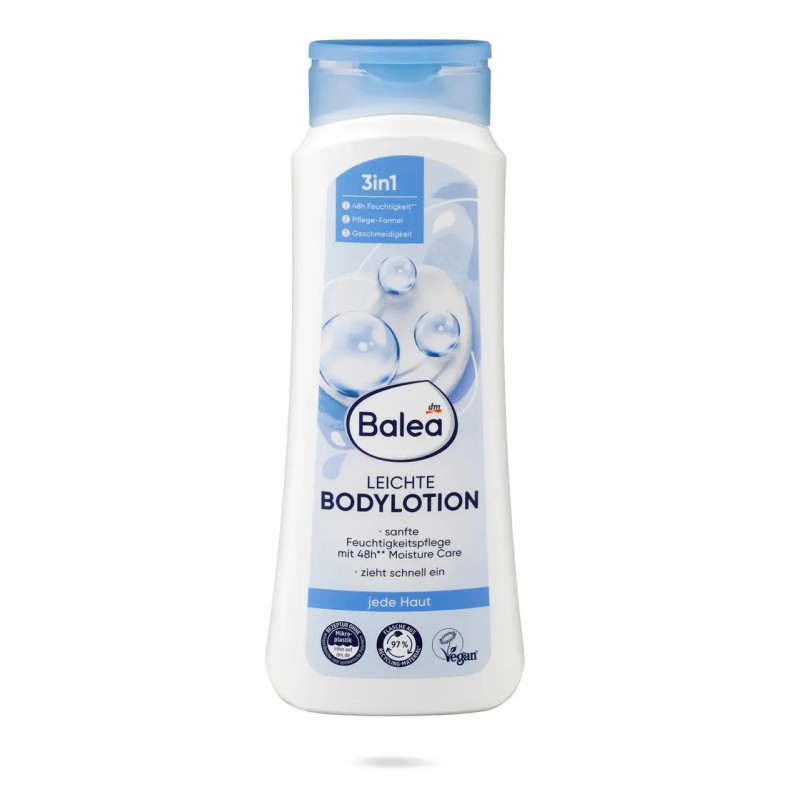 Лосьон Balea Leicte Bodylotion - средство для интенсивного увлажнения после очищения кожи подойдет для ежедневного ухода. В составе формулы есть витамин Е, который защищает кожу от пересыхания и устраняет ощущение стянутости и шелушения. Благодаря легкой структуре быстро наносится и быстро впитывается. Лосьон имеет приятный нейтральный запах, дарит восстанавливающий эффект и защищает кожу от потери влаги. Средство от Balea обладает веганской формулой и не содержит красителей, консервантов и минеральных масел, кожа будет мягкой и ухоженной.