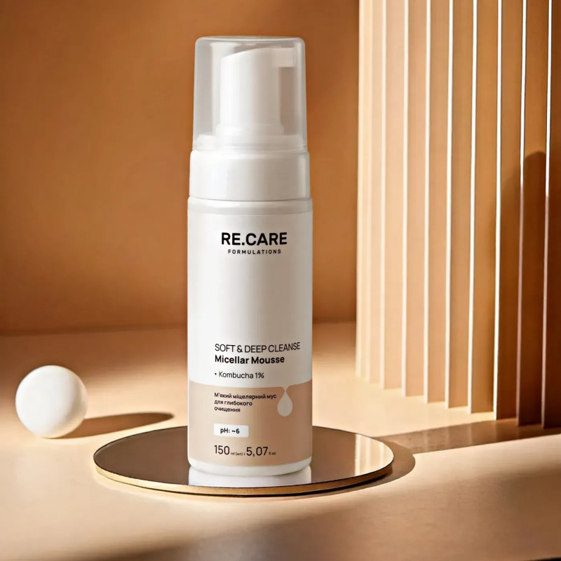 Мягкий мицеллярный мусс для глубокой очищения Soft & Deep Cleanse Micellar Mousse Re.Care деликатный уход и одновременно нуждается в глубокой очистке без сухости или раздражений. Легкая воздушная текстура превращается в мягкую пену, окутывающую кожу и тщательно удаляющую загрязнение, остатки декоративной косметики и избыток кожного сала. Мягкие моющие компоненты обеспечивают эффективную, но очень деликатную очистку, сохраняя естественный защитный барьер.