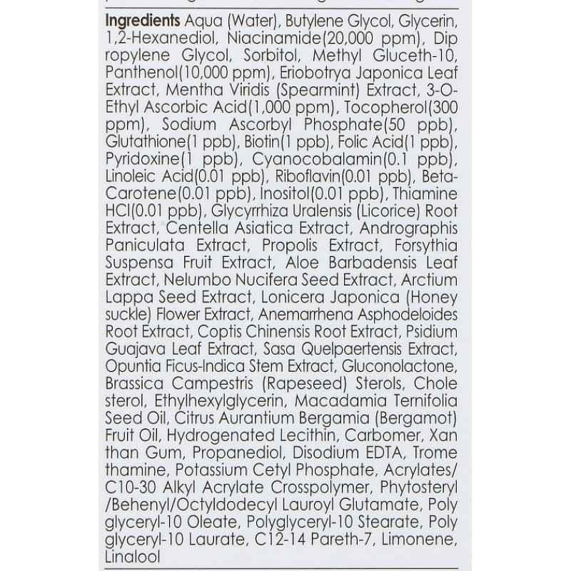 Состав: Aqua(Water), Dipropylene Glycol, 1,2-Hexanediol, Trehalose, Zinc PCA, Salix Nigra (Willow) Bark Extract, Leuconostoc/Radish Root Ferment Filtrate, Panthenol, Rumex Crispus Root Extract, Phaseolus Radiatus Extract, Lactobacillus/Pumpkin Ferment Extract, Betula Platyphylla Japonica Bark Extract, Betaine, Beta-Glucan, Allantoin, Polyglutamic Acid, Xylitol, Potassium Hydroxide, Butylene Glycol, Disodium EDTA.