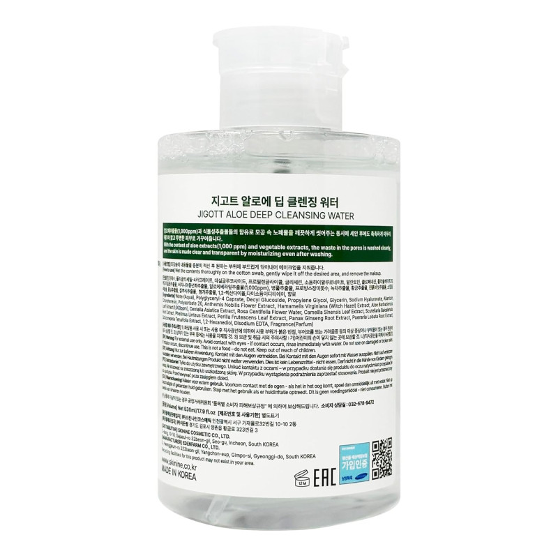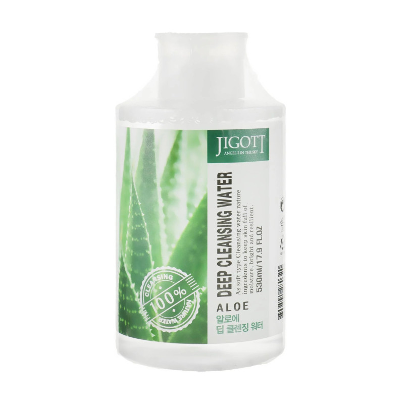 Засіб Jigott Aloe Deep Cleansing Water, 530 мл — це очищувальна вода для обличчя з екстрактом алое вера, яка дбайливо й ефективно очищає шкіру. Легко справляется с удалением макияжа, излишками себума и других загрязнений, одновременно поддерживая естественный уровень увлажнения. Благодаря успокаивающим свойствам, эта вода оставляет кожу свежей, мягкой и ухоженной, что делает ее отличным вариантом для ежедневного использования.