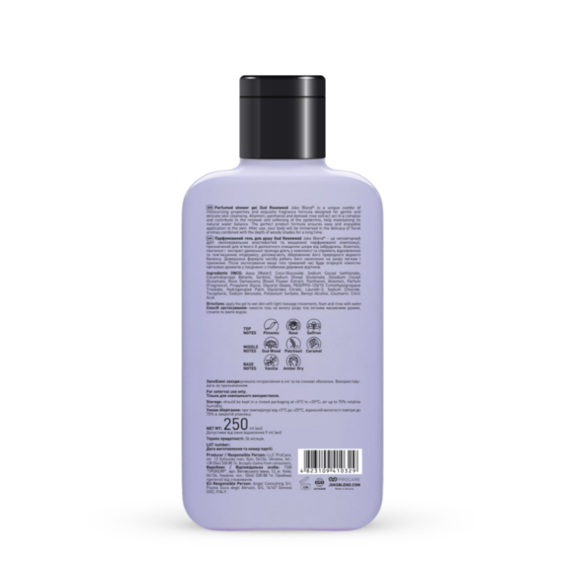Парфюмированный гель Oud Rosewood - изысканное сочетание деликатного очищения, интенсивного увлажнения и роскошного аромата. Гель имеет нежную текстуру, которая легко распределяется по коже, образуя пену, которая бережно очищает. В составе есть аллантоин - способствует восстановлению кожи, поддерживает естественные регенеративные процессы. Пантенол - интенсивно увлажняет, предотвращает сухость и стянутость. Экстракт даманской розы - смягчает, питает и успокаивает кожу, придавая ей ухоженный вид. После использования кожа становится гладкой, увлажненной и окутанной утонченным ароматом, в котором гармонично переплетаются цветочные ноты с древесными аккордами. Аромат Oud Rosewood - это пряно-сладкая композиция, где присутствуют шафран, роза, карамель и ваниль. Он создает атмосферу уютного вечера в интерьере с восточными мотивами. Средство от Joko Blend демонстрирует ощущение комфорта, свежести и нежности после каждого душа.