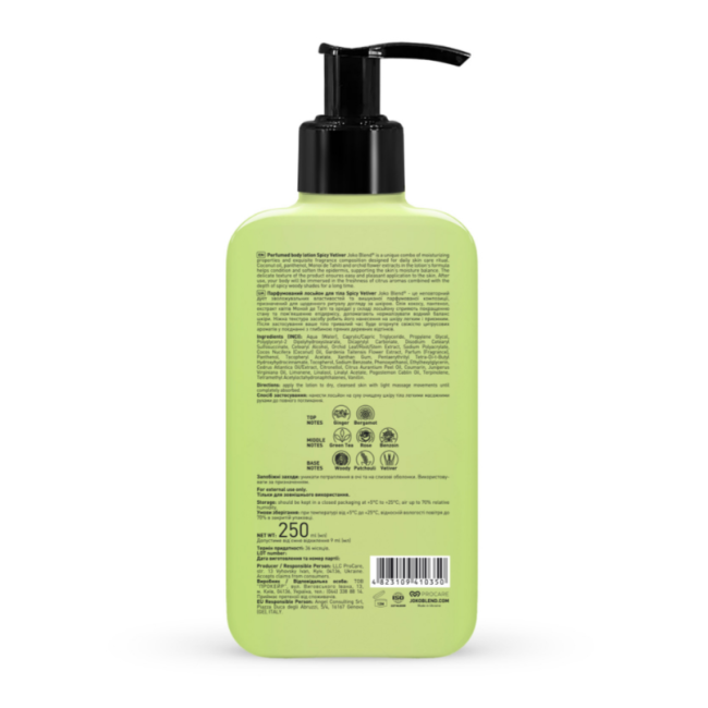 Парфюмированный лосьон Spicy Vetiver - это увлажняющий уход и изысканная композиция, которые дополняют ежедневный ритуал красоты. Лосьон имеет нежную и шелковистую текстуру, которая легко распределяется по коже, быстро впитывается и дарит мгновенное ощущение комфорта. В составе есть масло кокоса, которое интенсивно питает, помогает удерживать влагу в коже, делая ее мягкой, гладкой и эластичной. Пантенол - успокаивает, способствует восстановлению и поддерживает естественные регенеративные процессы кожи. Экстракты цветов орхидеи и Моной де Таити - глубоко увлажняют, защищают от негативного воздействия окружающей среды и помогают сохранить молодость и упругость кожи. Аромат Spicy Vetiver - наполнен имбирем, бергамотом, экстрактом зеленого чая и создает атмосферу гармонии и природной силы. Средство от Joko Blend легко наносится на тело, окутывает его освежающим ароматом и надолго оставляет ощущение ухоженности, уверенности и чистоты.