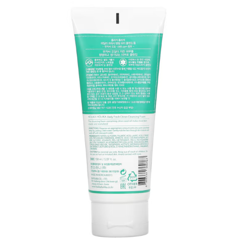 Пенка DAILY FRESH CITRON CLEANSING FOAM - интенсивно увлажняет, осветляет и выводит токсины из кожи. В составе есть экстракт цитрусов, который оздоравливает эпидермис и замедляют процессы старения. Средство состоит из комплекса жирных кислот, которые глубоко увлажняют, разглаживают текстуру кожи, уменьшают мимические морщины и замедляют возрастные изменения. Масло семян юдзу - насыщает клетки полезными микроэлементами, при этом оно деликатно осветляет кожу, стимулирует обновление клеток, растворяет загрязнения при контакте с водой и выводит токсины. Экстракт мыльнянки - проявляет свои очищающие и антибактериальные свойства, глубоко проникает в поры, нормализует работу сальных желез, устраняет жирный блеск и способствует лучшему проникновению кислорода в клетки. Глицерин - работает над увлажнением кожи, помогает избавиться от сухости, шелушения и ощущения стянутости. Пенка глубоко очищает, оздоравливает, успокаивает кожу и предотвращает появление высыпаний.Средство от Holika Holika это деликатный уход. который мягко очищает кожу и не вызывает раздражений.