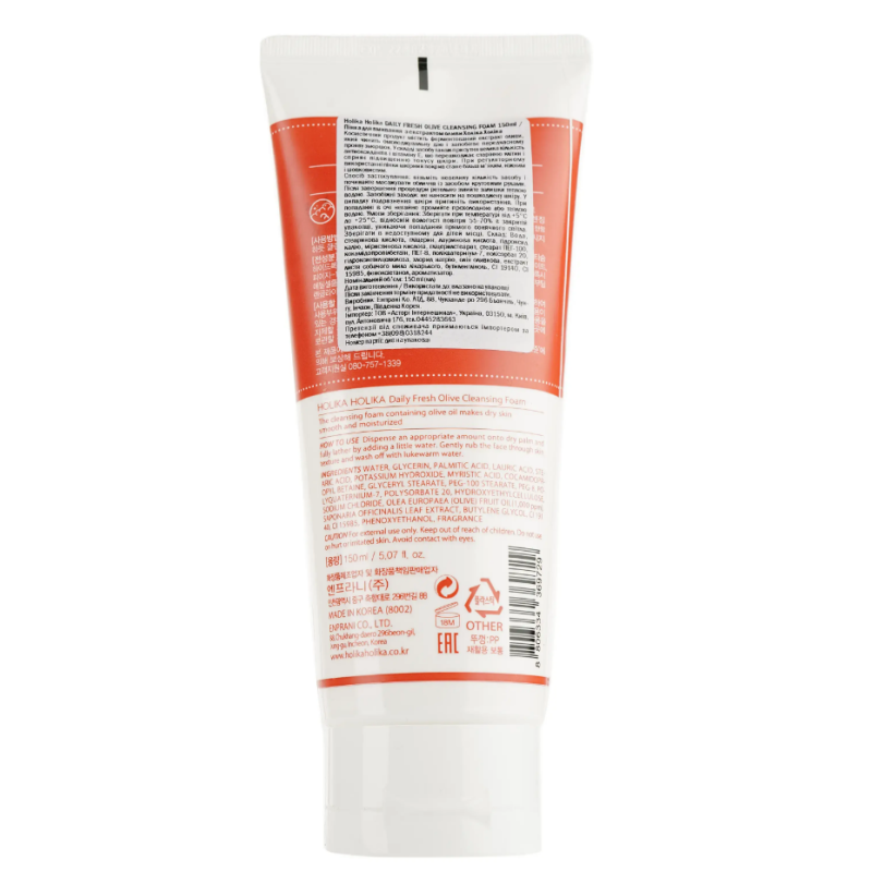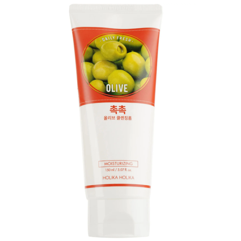 Пенка DAILY FRESH OLIVE CLEANSING FOAM - дарит прекрасное очищение, которое очень нужно коже. Она мягко удаляет загрязнения, остатки макияжа и избыточный себум, делая кожу ухоженной и свежей. В составе есть ферментированный экстракт оливы, обладающий омолаживающим эффектом и помогающий предотвратить появление морщин. Высокое содержание антиоксидантов и витамина E защищает клетки от преждевременного старения и способствуют поддержанию тонуса кожи. Средство борется с сухостью кожи, потерей тонуса и с признаками старения. Проявляет свои заживляющие и противовоспалительные свойства, помогает уменьшить раздражение и покраснение. Пенка идеально подойдет для сухой и чувствительной кожи, благодаря компонентам, которые поддерживают увлажненность. Средство от Holika Holika улучшит цвет лица, придаст ему матовости и уберет избыток себума.
