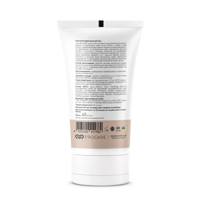 Постпилинговый защитный гель Post Peeling Protective gel Re.Care интенсивно успокаивает и восстанавливает кожу после процедур эксфолиации. Его формула деликатно работает с раздраженной, чувствительной и обезвоженной кожей, возвращая ей баланс, комфорт и гладкость уже с первых минут нанесения.