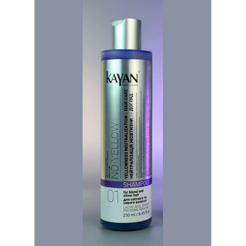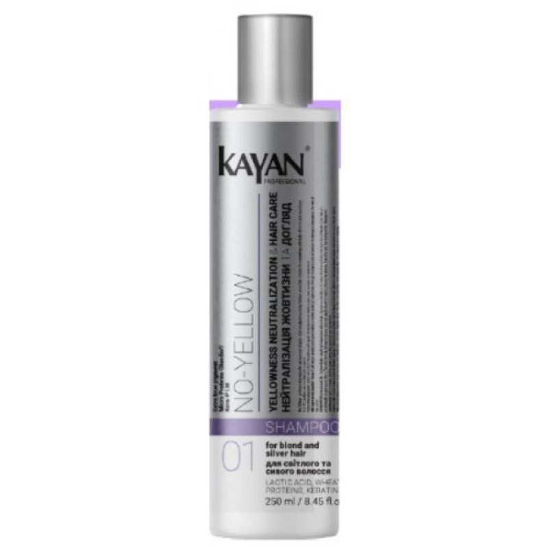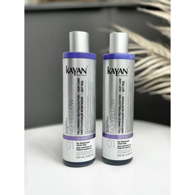 Шампунь для нейтрализации желтизны Kayan NO- YELLOW SHAMPOO разработан для осветленных и светлых волос. Он эффективно устраняет нежелательные теплые переливы, придавая волосам холодный оттенок. Благодаря специальным пигментам, шампунь подходит для всех оттенков блонда, такой как платиновый, пепельный и помогает поддержать благородный вид седины. Шампунь питает и восстанавливает волосы, придавая им здоровый вид, мягкость, шелковистость и естественный блеск. Средство предотвращает потускнение цвета, добавляя волосам блеска на долгое время. Во время пользования волосы очищаются, не пересушиваются и поддерживая их естественный баланс. В составе шампуня есть молочная кислота способствует разглаживанию поверхности волос, делая их мягкими и шелковистыми. Она хорошо укладывает волосы, наполняя их естественным блестящим оттенком, а также эффективно очищает кожу головы от излишков себума, обеспечивая ощущение свежести. Протеины пшеницы помогают улучшить структуру волос, предотвращая повреждения и добавляя естественный блеск. Они обеспечивают превосходный деликатный эффект, облегчая расчесывание и делая волосы гладкими и ухоженными. Шампунь станет надежным помощником в уходе за светлыми волосами, помогая поддерживать их красоту и здоровье ежедневно.После первого использования шампуня в сочетании с маской Kayan волосы приобретают красивый серебристый оттенок.