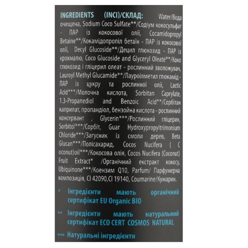 Состав: Water (вода), Sodium Coco Sulfate (ПАР из кокосового масла), Cocamidopropyl Betaine (ПАР из кокосового масла), Decyl Glucoside (ПАР из крахмала), Composition (Coco Glucoside (and) Glyceryl Oleate) ** (растительный увлажнитель), Lauroyl Methyl Glucamide (ПАР из сахара и растительного масла), Lactic Acid (молочная кислота из кукурузы), Composition (Sorbitan Caprylate, 1.3-Propanediol and Benzoic Acid) (растительный консервант), Glycerin (растительный глицерин), Sorbitol (растительный увлажнитель), Guar Hydroxypropyltrimonium Chloride (загуститель из смолы деревьев), Beta Glucan (полисахарид), Cocos Nucifera (Сoconut) oil ( кокосовое масло), Cocos Nucifera (Coconut) Fruit Extract (органический экстракт кокоса), Parfum, Colour.