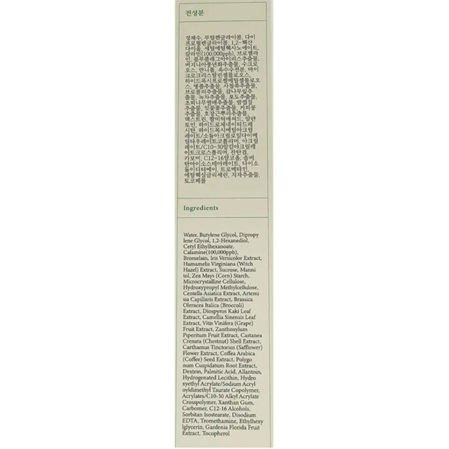 Состав: Water, Butylene Glycol, Dipropylene Glycol, 1.2-Hexanediol, Cetyl Ethylhexanoate, Calamine, Bromelain, Iris Versicolor Extract, Hamamelis Virginiana (Witch Hazel) Extract, Sucrose, Mannitol, Zea Mays (Corn) Starch, Microcrystalline Cellulose, Hydroxypropyl Methylcellulose, Centella Asiatica Extract, Artemisia Capillaris Extract, Brassica Oleracea Italica (Broccoli) Extract, Diospyros Kaki Leaf Extract, Camellia Sinensis Leaf Extract, Vitis Vinifera (Grape) Fruit Extract, Zanthoxylum Piperitum Fruit Extract, Castanea Crenata (Chestnut) Shell Extract, Carthamus Tinctorius (Safflower) Flower Extract, Coffea Arabica (Coffee) Seed Extract, Polygonum Cuspidatum Root Extract, Dextrin, Palmitic Acid, Allantoin, Hydrogenated Lecithin, Hydroxyethyl Acrylate/Sodium Acryloyldimethyl Taurate Copolymer, Acrylates/C10-30 Alkyl Acrylate Crosspolymer, Xanthan Gum, Carbomer, C12-16 Alcohols, Sorbitan Isostearate, Disodium EDTA, Tromethamine, Ethylhexylglycerin, Gardenia Florida Fruit Extract, Tocopherol.