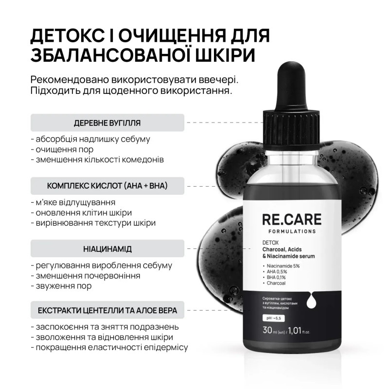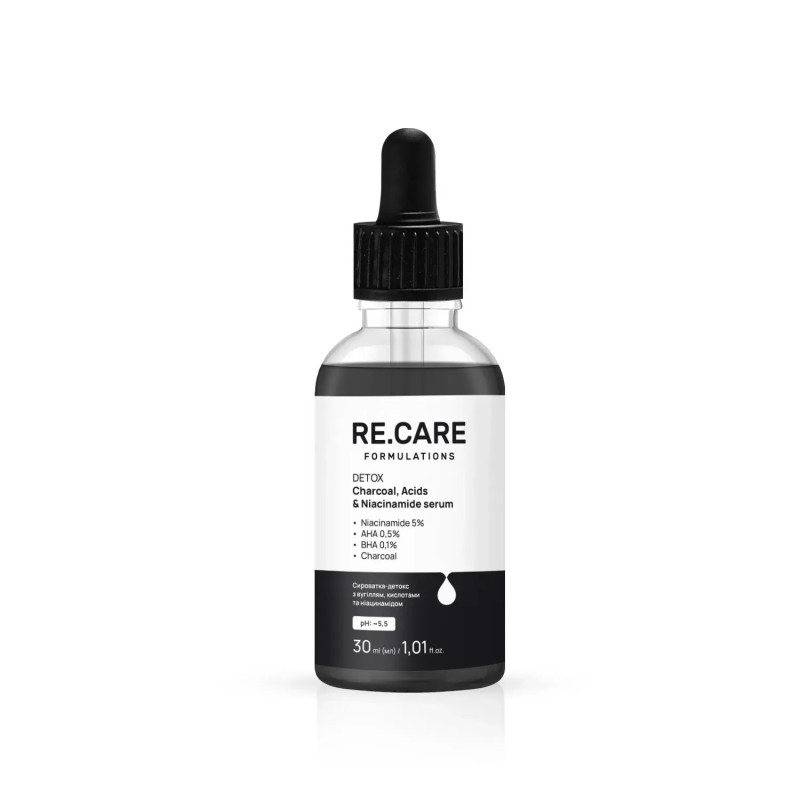 Сыворотка-детокс с углем, кислотами и ниацинамидом Detox Charcoal, Acids & Niacinamide Serum REC. Это многофункциональная сыворотка, предназначенная для комплексного обновления и глубокого оздоровления кожи, которая требует контроля над несовершенствами, выравнивания тона и мягкого отшелушивания. Ее формула объединяет несколько групп активных веществ, работающих согласованно и дополняющих друг друга.