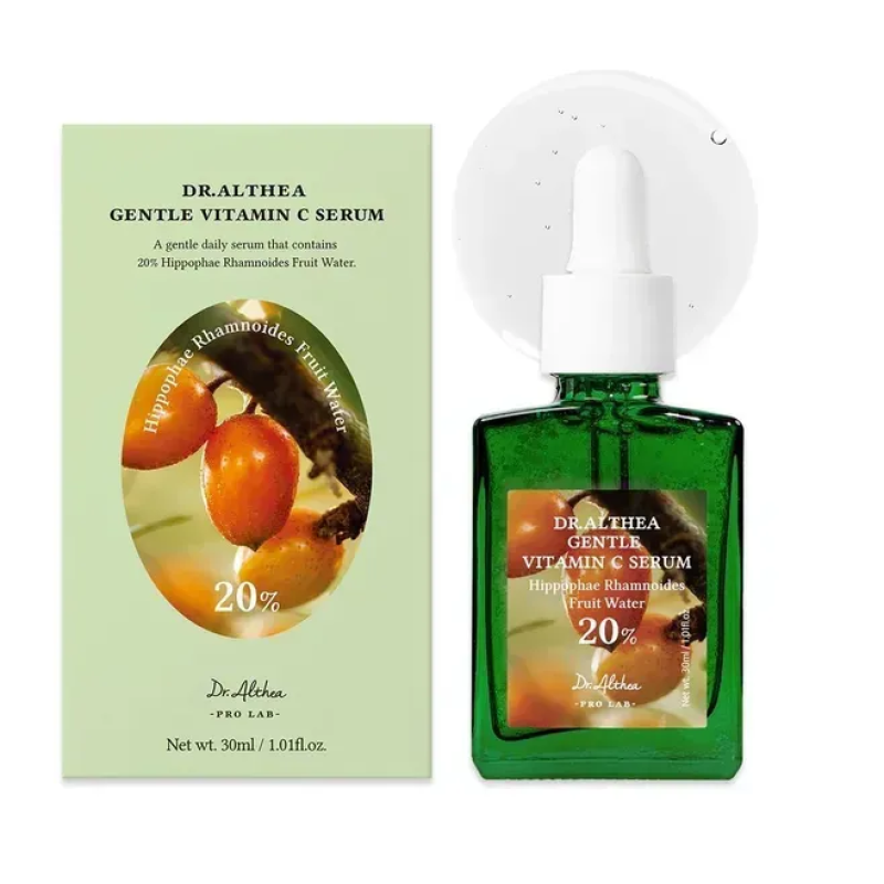 Сыворотка Gentle Vitamin C Serum - средство подходит для ежедневного использования, имеет легкую текстуру и высокую концентрацию активных компонентов, которые создают заметный эффект после применения. В составе есть витамин С - мощный антиоксидант, выравнивает тон кожи, осветляет пигментные пятна и стимулирует выработку коллагена. Экстракт плодов облепихи - антиоксидант, замедляет процессы старения. Ниацинамид - уменьшает пигментацию, укрепляет кожный барьер и повышает уровень увлажненности. Куркума - регулирует выработку меланина, успокаивает кожу, способствует регенерации и борется с прыщами. Масло облепихи - питает, разглаживает кожу, сохраняет влагу и предотвращает появление новых морщин. Гиалуроновая кислота - интенсивно увлажняет, удерживая влагу в клетках. Алантоин - успокаивает, смягчает и стимулирует восстановление кожи. Витамин Е - обеспечивает антиоксидантную защиту, питает и повышает эластичность. Аденозин - способствует уменьшению морщин и возвращает упругость. Сыворотка работает над осветлением и выравниванием тона кожи, уменьшает пигментные пятна и признаки усталости, глубоко увлажняет и питает. Средство от Dr.Althea помогает уменьшить проявления старения, стимулирует образование коллагена и возвращает коже свежий вид.