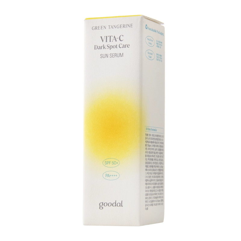 Солнцезащитная сыворотка против пигментации с витамином C Goodal Green Tangerine Vita C Dark Spot Care Sun Serum сочетает в себе мощную SPF-защиту, интенсивное увлажнение и уход за тоном кожи. Благодаря ультрасовременным UVA и UVB фильтрам, таким как Tinosorb S, Uvinul A Plus и Triazones, продукт надежно защищает от фотостарения, солнечных ожогов и пигментации.