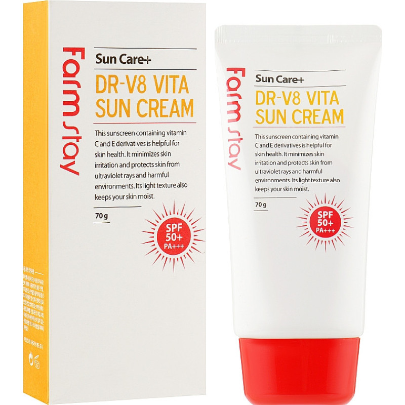 Функциональный крем DR-V8 Vita Sun Cream SPF50+, PA+++ обладает уникальными фотопротекторными свойствами. Он интенсивно увлажняет, питает, витаминизирует кожу, придает ей гладкость и упругость, предотвращает фотостарение. Отдых порадует приятными воспоминаниями, если Вы воспользуетесь этим препаратом.