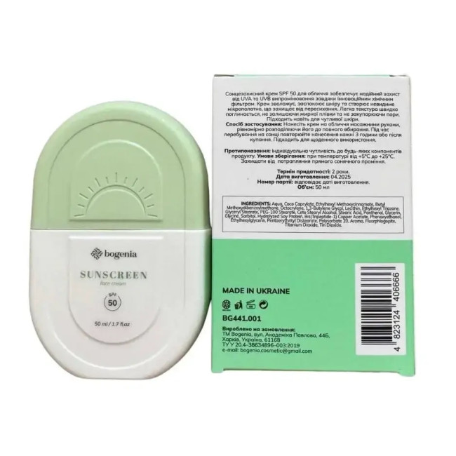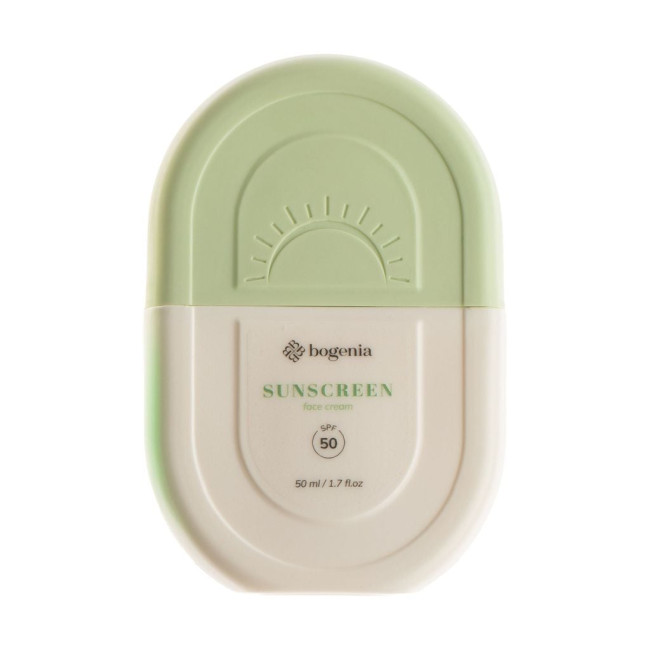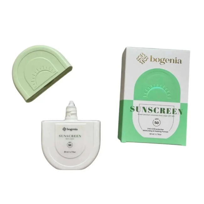 Солнцезащитный крем Sunscreeen Face Cream SPF50+ТМ Bogenia надежно защищает кожу от ультрафиолетового излучения благодаря комплексу фильтров, включая этилгексил метоксикинамат, бутил метоксидибензоилметан, октилкрилен и этилгексил триазон. Мягкая текстура на основе кокосового каприлата легко распределяется, не оставляя жирный след, а титановый диоксид и двуоксид олова создают дополнительный барьер от солнца.