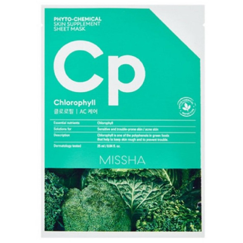 Тканевая маска Missha Phytochemical Skin Supplement Sheet Mask Chlorophyll/AC Care - универсальное увлажняющее, противовоспалительное, омолаживающее средство для кожи лица. Гипоаллергенная тканевая основа плотно прилегает к коже, обеспечивая быструю и глубокую абсорбцию эссенции в эпидермис.