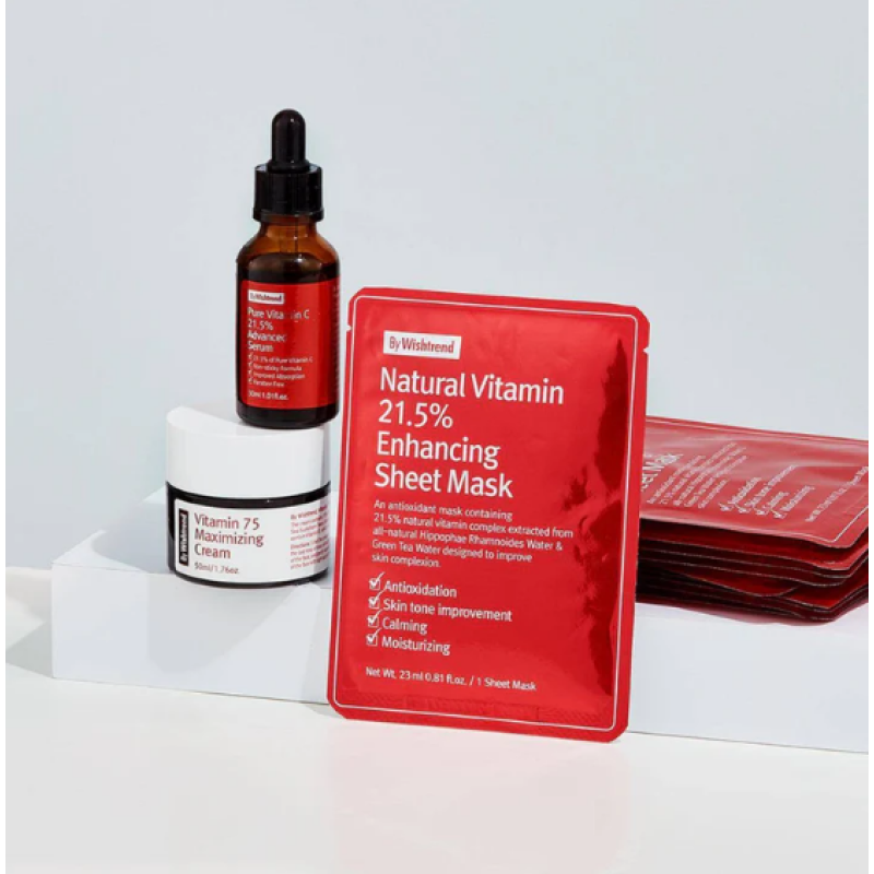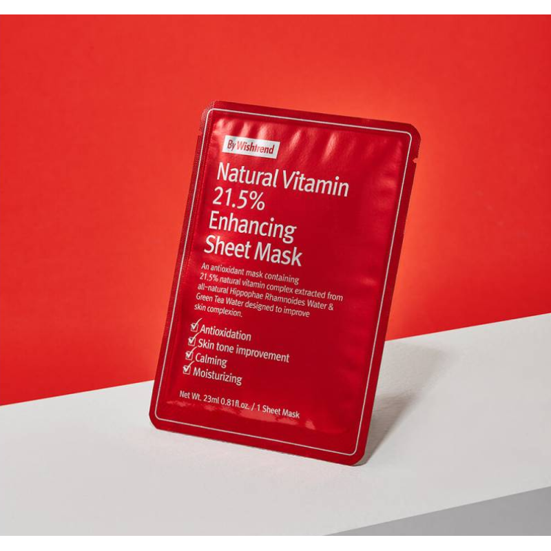 Маска Natural Vitamin 21.5% Enhancing Sheet Mask - средство, которое содержит гидролат облепихи, богатый витамином С, выравнивает тон кожи и придает ей естественное сияние. Средство создает не просто увлажнение, а комплексный уход, который сочетает в себе восстановление, питание и борьбу с первыми признаками старения. Экстракт зеленого чая - снимает воспаление, тонизирует и освежает. Гиалуронат натрия и гиалуроновая кислота - интенсивно увлажняют, сохраняют влагу в клетках, делают кожу мягкой и упругой. Бетаин - помогает удерживать влагу в эпидермисе, успокаивает раздражение и ускоряет регенерацию. Экстракт танжерина - укрепляет сосуды и предотвращает появление купероза. Маска проявляет себя, как легкий кислотный пилинг, осветляет и обновляет кожу, даря ей свежий и здоровый вид. Средство от By Wishtrend рекомендовано для сухой, комбинированной и зрелой кожи, и кожи в тусклом виде, которая имеет первые признаки старения и потери упругости.