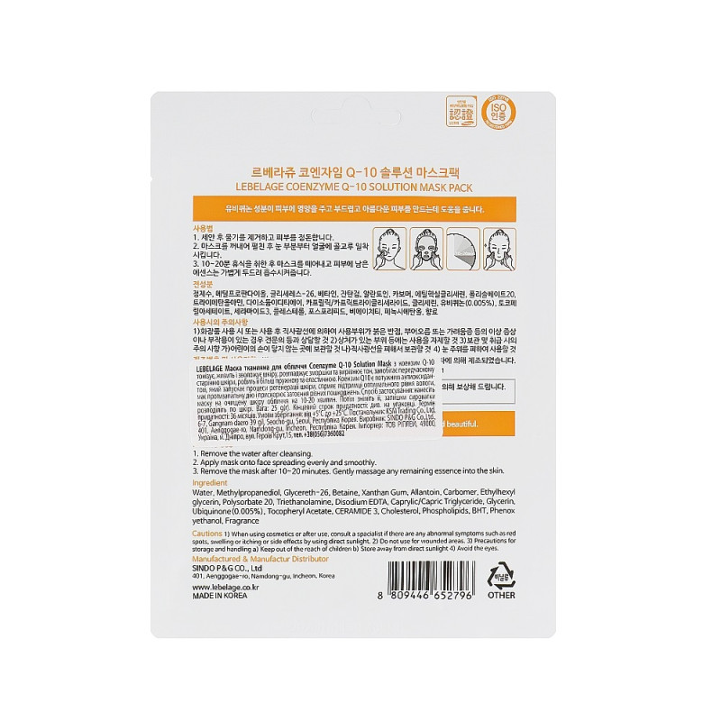 Тканевая маска для лица с коэнзимом Q10 Lebelage Coenzyme Q-10 Solution Mask обеспечивает всесторонний уход за кожей: глубокое увлажнение, питание, антиоксидантную защиту и восстановление.