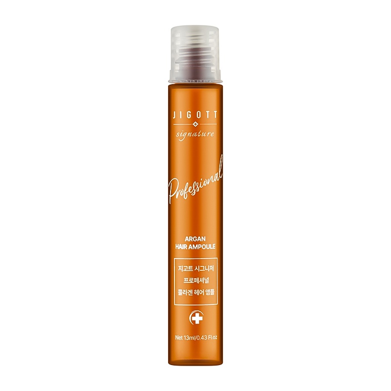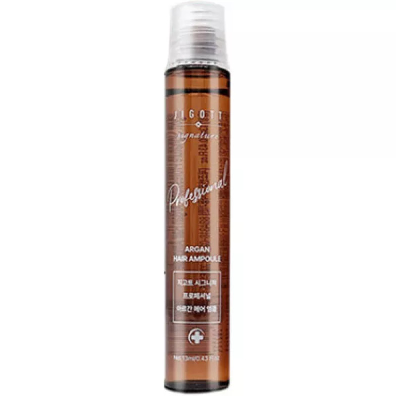 Ампула Jigott Signature Professional Argan Hair Ampoule -забезпечує догляд за пошкодженими пасмами, завдяки в складі арганової олії, яка допомагає утримувати кутикулу та комплекс рослинних олій, що додають волоссю гладкість і блиск. Ампула - спеціально розроблена, щоб відновити і зміцнити пошкоджене волосся, бо її ключовий компонент багатий на жирні кислоти і вітаміни, що робить його ефективним засобом для живлення волосся. Арганова олія ефективно защищає від високих температур і забруднення навколишнього середовища. Засіб має легку структуру, яка швидко вбирається в волосся, не залишаючи жирного блиску. Ампула забезпечить волоссю глибоке зволоження і живлення, що робить волосся сильним, еластичним і блискучим. Засіб від Jigott підходить для всіх типів волосся, навіть сухого і чутливого.