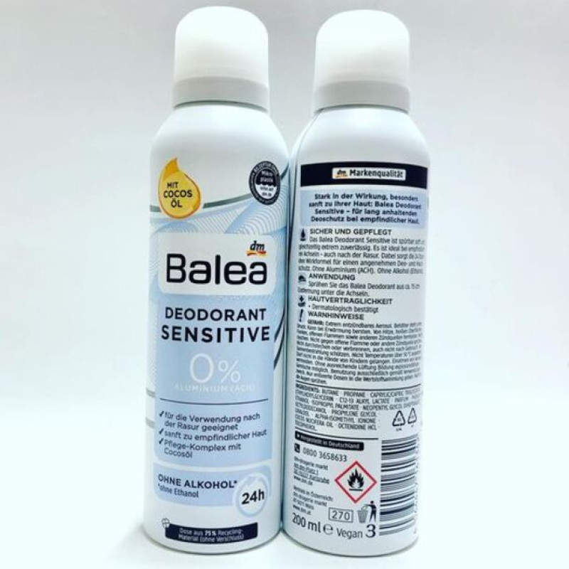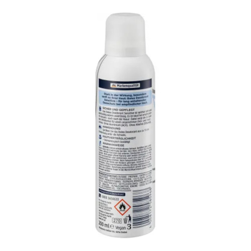 Антиперспірант Balea Sensitive - має свіжий і приятний аромат, який дбає про чуттєвий догляд за шкірою. Формула засобу насичена кокосовим маслом. який зволожує і заспокоює шкіру. В складі немає спирту і алюмінію, який може нашкодити здоров'ю. Активна формула працює протягом 24 годин, що забезпечує ефективний дезодоруючий захист від неприємних запахів. Засіб від Balea підходит для чуттєвої шкіри, формула не містить мікропластику і синтетичних полімерів, які сприяють збереженню природи. Антиперспірант захистить шкіру навіть після гоління і не буде виникати некомфортного відчуття.