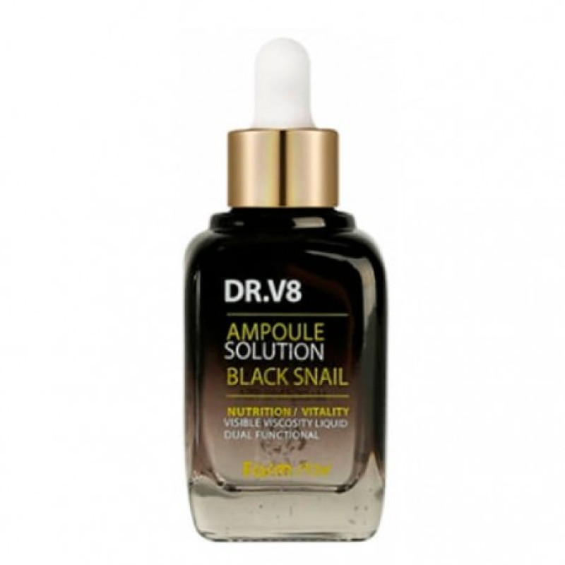 Ампульна сироватка, що омолоджує, DR.V8 Ampoule Solution Black Snail — висококонцентрований засіб для омолодження та гідратації шкіри. Завдяки цьому продукту шкіра набуде рівномірного відтінку, зморшки стануть менш помітними, шкіра насичується вітамінним комплексом.