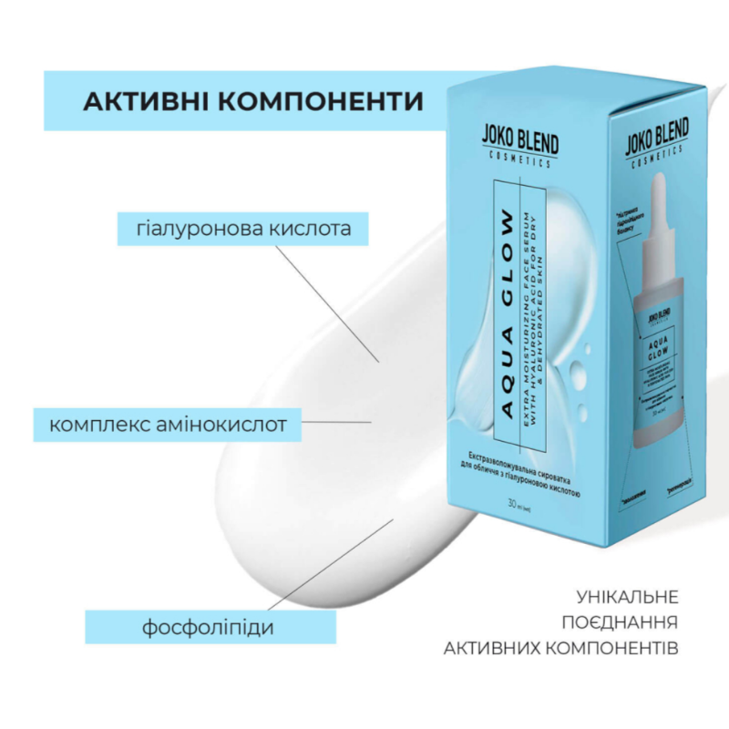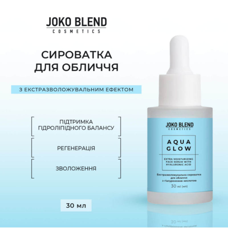 Сироватка для обличчя Aqua Glow забезпечує інтенсивне та тривале зволоження, сприяє виробленню власного колагену та підтримує здоровий гідроліпідний баланс шкіри. Засіб завдяки натуральному комплексу допомагає відновленню та регенерації, зберігаючи еластичність, пружність та природне сяйво шкіри. В складі є комплекс керамідів і фосфоліпідів рослинного походження відновлює захисний бар'єр шкіри, підвищує її стійкість до негативного впливу зовнішніх факторів і сприяє утриманню вологи. Комплекс амінокислот - підсилює бар'єрні та захисні функції шкіри, покращує її тон, розгладжує та повертає здорове сяйво. Низькомолекулярна гіалуронова кислота- глибоко проникає в шари шкіри, миттєво зволожує, відновлює еластичність і забезпечує свіжий, доглянутий вигляд. Сироватка забезпечує глибоке зволоження, підвищує пружність, еластичність. Засіб підвищує пружність, еластичність, швидко вбирається та ідеально підходить під макіяж. Сироватка від Joko Blend вирівнює тон і робить шкіру більш здоровою та доглянутою.