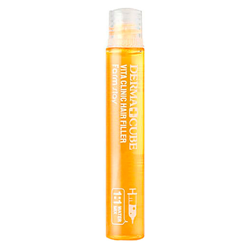 Високоефективний філер Derma Cubed Vita Clinic Hair Filler інтенсивно відновлює пошкоджені волоски, заповнюючи міжклітинні порожнечі та склеюючи кутикулярні лусочки.