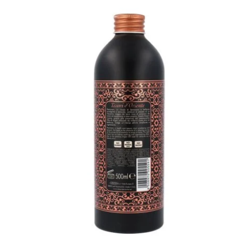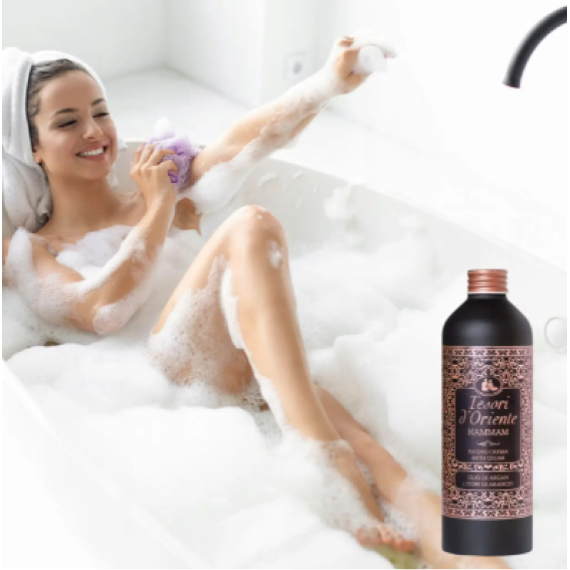 Гель-піна Hammam - перетворює щоденні водні процедури на справжній ритуал насолоди та відновлення. В складі є арганова олія - інтенсивно живить шкіру, надаючи їй неймовірну м'якість, шовковистість та комфорт. Засіб ефективно запобігає сухості та відчуття стягнустості, підтримує оптимальний рівень зволоження, зміцнює природний захисний бар'єр шкіри та стимулює оновлення шкіри. Аромат наповнений цитрусовими нотками, які доповнені жасмином, ванілю, амбра та чуттєвим мускусом. Аромат проявляє ароматерапевтичний ефект - заспокоює, знімає напругу та дарує відчуття комфорту. Формул гель-піни на основі натуральних олій забезпечує, м'яку, очищувальну, заспокійливу та відновлювальну дію. Ніжна гелева текстура легко розподіляється по шкірі та миттєво перетворюється на піну при контакті з водою, огортаючи тіло витонченим ароматом. Засіб від Tesori d'Oriente робить шкіру доглянутою, пружною та наповненою життєвою енергією.