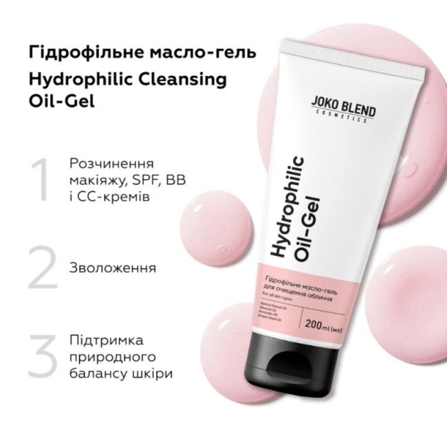 Гідрофільне масло-гель Hydrophilic Cleansing Oil-Gel створене для очищення шкіри та ефективного розчинення макіяжу, а також різних тональних засобів. Після використання засіб дарує відчуття свіжості, чистоти та комфорту, при цьому не викликаючи сухості та стягнутості. В склад входить комплекс натуральних олій - абрикосова, миндальна, макадамії та жожоба. Вони дбайливо очищують шкіру, водночас живить її цінними поживними речовинами, зволожують, заспокоюють та покращують структуру. Засіб володіє приємним ароматом, який робить щоденний ритуал ще більш приємним, а використання вранці та ввечері допомагає підтримувати здоровий вигляд шкіри, природне сяйво та рівний тон. Масло-гель від Joko Blend легко емульгується при контакті з водою та не забиває пори.