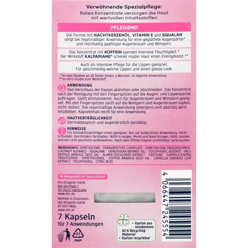 Концентрат Balea Konzentrat Augen & Lippen - ефективний засіб для догляду за делікатною шкірою навколо очей, губ, і вій. Він бореться з ознаками втоми і недосипання, забезпечує інтенсивне зволоження цих ділянок. В складі є кофеїн, олія примули вечірньої, вітамін Е, які сприяють відновленню шкіри. Концентрат володіє багатофункціональністю, бо підходить для догляду за ніжною шкірою на обличчі. Засіб допомагає зменшити почервоніння, запалення і подразнення, створює бар'єр, який оберігає шкіру від негативного впливу навколишнього середовища. Засіб від Balea покращує стан брів і вій, запобігає їх зміцненню, а губи робить гладенькими і м'якими.