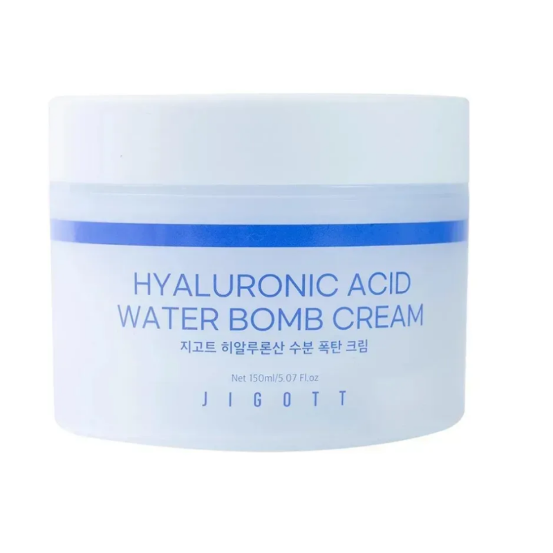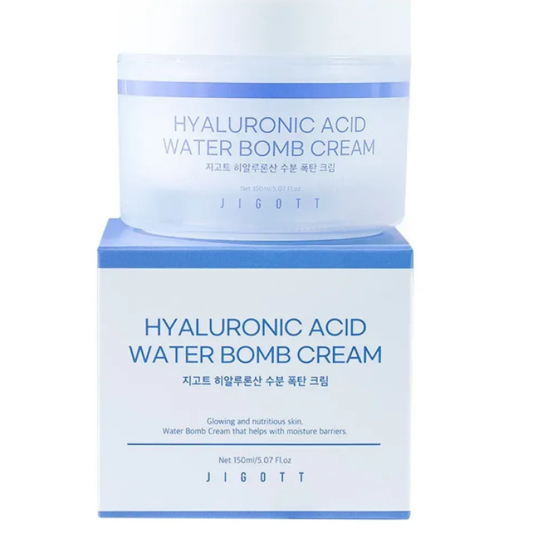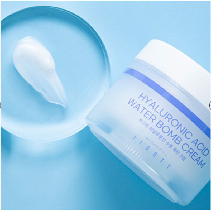 Крем для обличчя Hyaluronic Acid Water bomb Cream - подарує довготривале зволоження, покращить еластичність і зміцнить захисний бар'єр. В складі є гіалуронова кислота різної форми, яка глибоко проникає в шари шкіри, ефективно підтримує вологу і стимулює вироблення природного колагену. Екстракт волошки - проявляє свою антиоксидантну, протизапальну і очищувальну дію. Екстракт ромашки - відомий заспокійливими, антисептичними властивостями і допомагає зменшити подразнення. Крем має невагому водянисту структуру, яка миттєво зволожує, даруючи відчуття свіжості та комфорту. Завдяки комплексу гіалуронової кислоти, шкіра стає гладенькою, пружною і захищає від передчасного старіння. Крем вирівнює тон обличчя, пришвидшує регенерацію шкіри і підвищує стійкість шкіри до зовнішнього впливу. Засіб від Jigott стане помічником у щоденному догляді. особливо коли потрібно відновити шкіру.