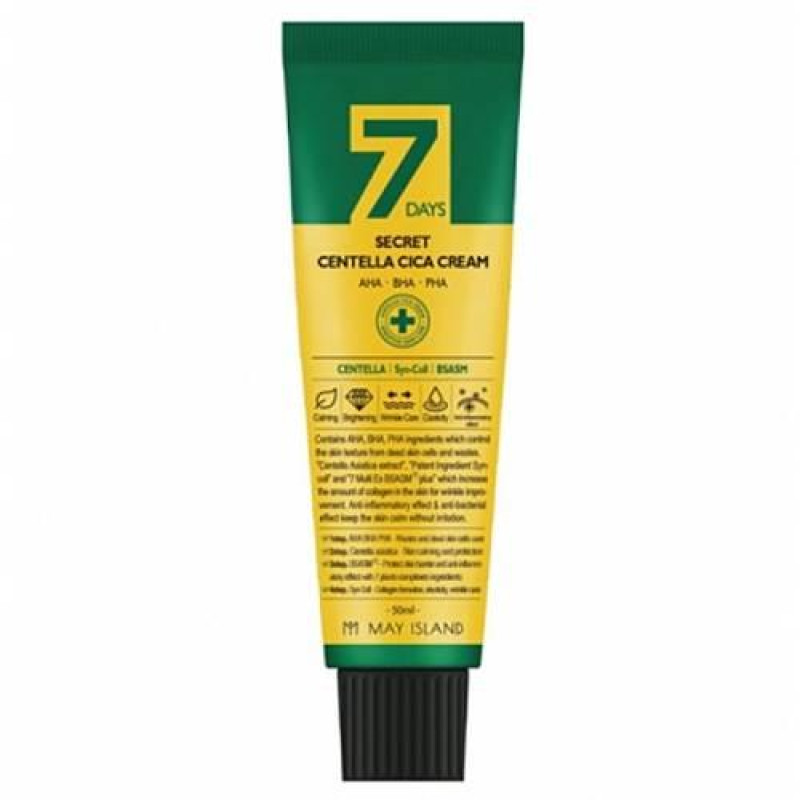 Крем для обличчя May Island 7 Days Secret Centella Cica Cream - чудово відновлює шкіру та допомагає у лікуванні акне. Інтенсивно зволожує, освітлює пігментацію, вирівнює рельєф, регулює вироблення шкірного сала, сприяє швидкій регенерації клітин. Робить шкіру гладкою, пружною, м'якою та сяючою.