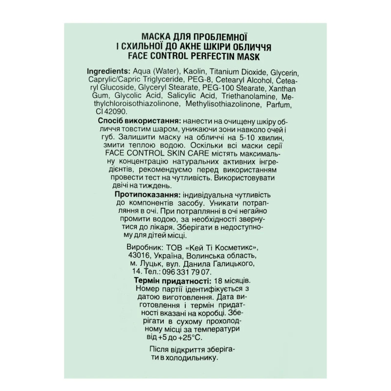 Застосування: нанести на очищену шкіру обличчя товстим