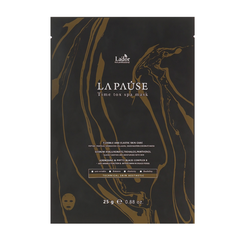 Тканинна маска La-Pause Time Tox SPA Mask допомагає сповільнити перебіг часу. Засіб призначений для активної профілактики вікових змін, дбайливого догляду за шкірою всіх типів.