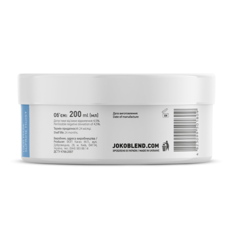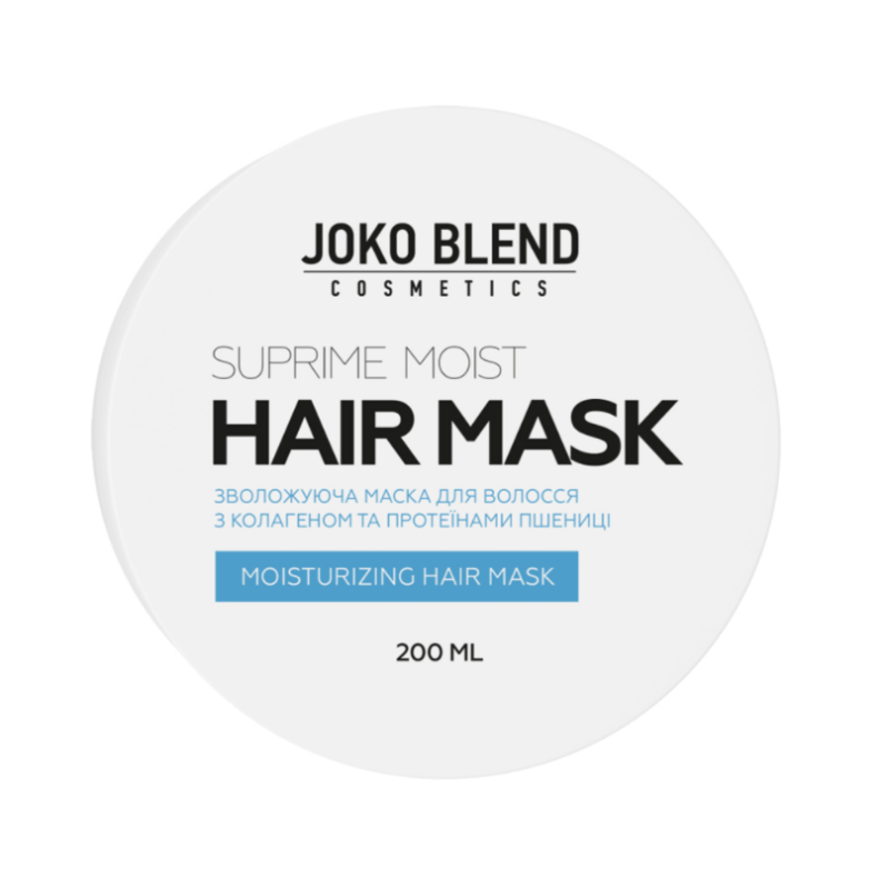 Зволожувальна маска Suprime Moist створена для інтенсивного догляду за волоссям будь-якого типу. Вона глибоко зволожує та живить, надає волоссю гладкості, природного блиску та яскравості. Маска зміцнює стрижень волосся, зменшує ламкість та посічені кінчики. В складі є колаген - активно живить та зволожує волосся, надаючи йому міцності та еластичності. Пшеничний протеїн- сприяє оновленню та відновлення волосся. Олія зародків пшениці - інтенсивно живить, зволожує та зміцнює волосся, при цьому надає йому гладкості. Олія жожоба - імітує природний себум, допомагає підтримувати баланс зволоження та запобігти сухості. Лляна олія - насичує волосся омега 3, підвищує еластичність та захищає від пошкоджень.Екстракт кокоса- пом'якшує волосся та надає йому здорового вигляду. Екстракт малини - насичує волосся та захищає волосся від зовнішніх чинників. Екстракт звіробою - допомагає підтримувати здоров'я шкіри, завдяки антибактеріальним та протизапальним властивостям. Маска від Joko Blend проявляє комплексний догляд,: інтенсивно зволожує, зміцнює волосся та зменшує ламкість та посіченість.