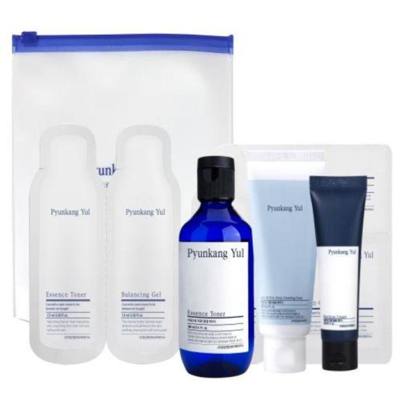 Набір Pyunkang yul Essence Toner 100мл + Nutrition Cream 9ml + Low pH Pore 40мл + Набір Пробників 4шт - містить піну для вмивання, есенцію-тонер, живильний крем і чотири пробники. У комплекті йде стильна прозора косметичка, яку зручно брати з собою в подорож.