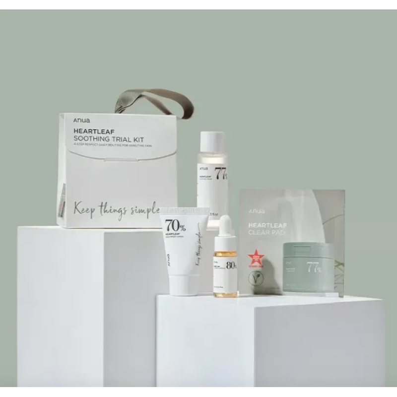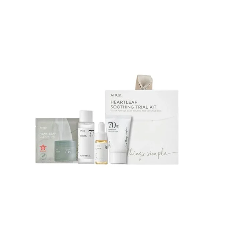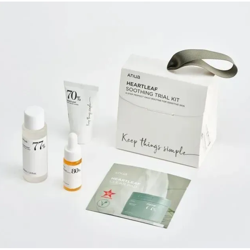 Набір мініатюр Heartleaf Soothing Trial Kit - створений для заспокоєння, зволоження та очищення в одному комплекті. Тонер Heartleaf 77% Soothing Toner (40 мл) - легкий заспокійливий засіб, що зменшує почервоніння і готує шкіру до подальшого догляду. Лосьйон Heartleaf 70 Daily Relief Lotion (20 мл) - м'який зволожувальний засіб, що заспокоїть та пом'якшить шкіру. Ампула Heartleaf 80% Soothing Ampoule (10 мл) - концентрат для швидкого заспокоєння подразненої та чутливої шкіри. Тонер-педи Heartleaf 77 Clear Pad (1 упаковка, 2 шт.) - подушечки для м'якого очищення та вирівнювання текстури. Кожний засіб в комплекті має екстракт хауттюйнії серцеподібної, який відомий потужними заспокійливими та протизапальними властивостями, усуває висипання та знижує чутливість. Центелла азіатська - допомагає зняти подразнення, зміцнити бар'єр шкіри. Гіалуронова кислота - інтенсивно зволожує, запобігає сухості та підтримує пружність. Бетаїн - зміцнює клітинні мембрани і надає шкірі м'якості. У компактному наборі від Anua зібрано чотири базові продукти для повноцінного догляду, це очищення, тонізація, зволоження та заспокоєння. Набір підходить для подорожей, тестування або як подарунок для інтенсивного догляду.