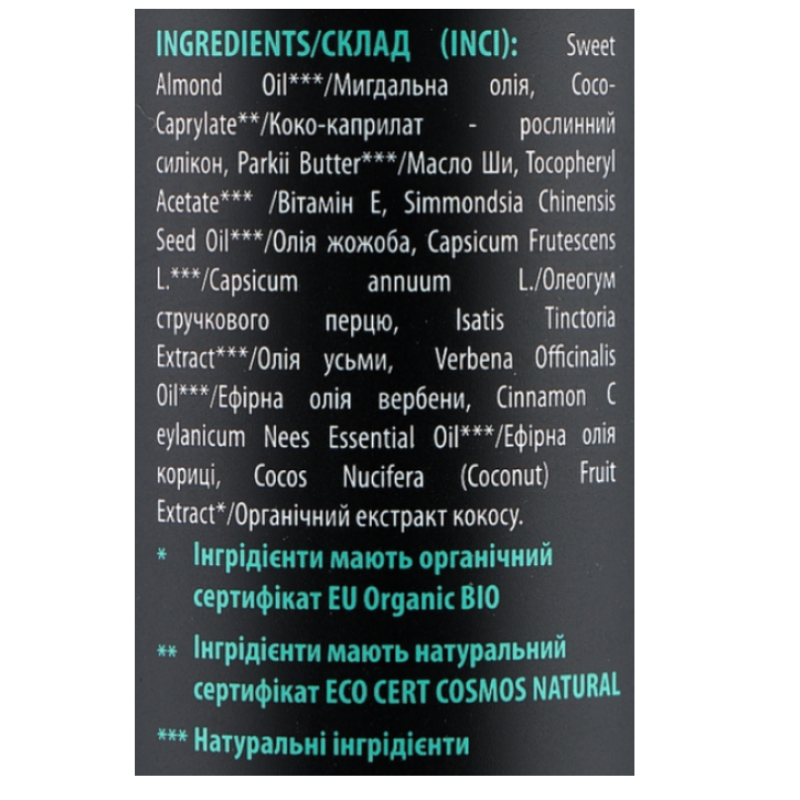 Склад: Sweet Almond Oil (Мигдальна олія), Coco-Caprylate (Коко-каприлат — рослинний силікон), Parkii Butter (Масло Ши), Tocopheryl Acetate (Вітамін E), Simmondsia Chinensis Seed Oil (Олія жожоба), Capsicum Frutescens L. / Capsicum annuum L. (Олеорезин стручкового перцю), Isatis Tinctoria Extract (Олія усми), Verbena Officinalis Oil (Ефірна олія вербени), Cinnamomum Ceylanicum Nees Essential Oil (Ефірна олія кориці), Cocos Nucifera (Coconut) Fruit Extract (Органічний екстракт кокосу).