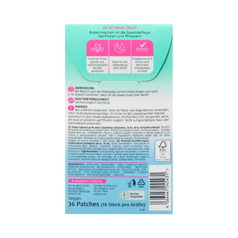 Патчі Hautrein Anti-Pickel Patches ефективно борються із запаленнями, зменшують почервоніння, підсушують недоліки та прискорюють загоєння ран. В складі є саліцилова кислота проявляє свою потужну антибактеріальну дію та допомагає прибрати дискомфортні відчуття. Засіб активно очищує пори, усуває запалення, підсушують шкіри та прискорюють загоєння. Патчі після застосування заспокоюють і зменшують свербіж, а також допомагають боротися з прищами і чорними цятками, мають прозорий вигляд майже непомітні на шкірі. Засіб від Balea швидко підсушує висипання, результат помітний після першого користування.
