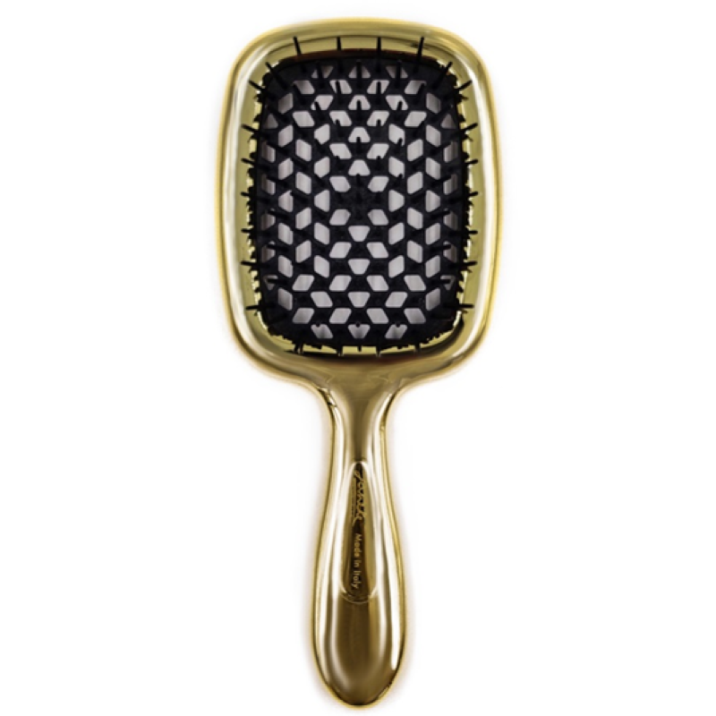 Золота з чорним гребінець Janeke Superbrush підходить для догляду за будь-яким волоссям (коротким, довгим, кучерявим і пофарбованим). Вона легко позбавить вас вузликів на пасмах, допоможе зробити акуратне укладання з феном.