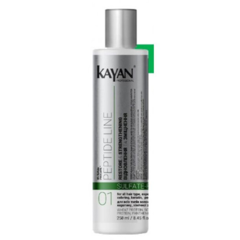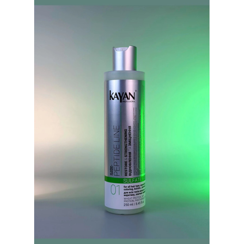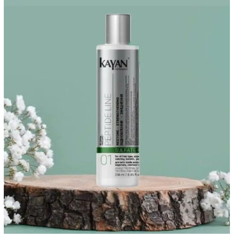 Безсульфатний шампунь Kayan Peptide Line Sufate-Free для всіх типів волосся, для локонів, які піддавалися фарбуванню, кератиновому випромінюванню або хімічній завивці. Професійний засіб, який забезпечує ефективне очищення шкіри, не пересушуючи корені волосся та зберігає природне здоров'я волосся. Шампунь зволожує, зміцнює волосся, надає йому м'якості і підтримує його в такому стані. Відсутність сульфатів робить шампунь ідеальним виробом для делікатного догляду. Гідролізований пшеничний білок- покращує здатність волосся затримувати вологу, і знижаючи ламкість волосся. Пантенол також інтенсивно зволожує волосся, додає йому блиску і гладкості, сприяє швидкому відновленню клітин. Гідролізований соєвий білок - це компонент допомогає відновити структуру волосся. Шампунь забезпечує зволоження та зміцнює волосся, допомагаючи відновити його природну силу. Він підвищує пружність локонів, зменшує ламкість і запобігає їхньому пошкодженню. Засіб стимулює здоровий ріст волосся, роблячи його густішим і міцнішим. Завдяки м’якій формулі шампунь Kayan Professional підходить для щоденного використання, не пошкоджуючи волосся і шкіру голови.
