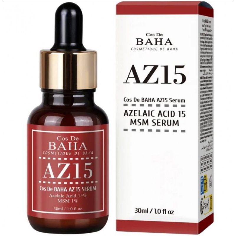 Сироватка AZ15 Serum (AZ15) - засіб, ефективно бореться з акне, зменшує пігментацію, вирівнює тон шкіри та покращує загальний її стан. В складі є 15 % азеленоївої кислоти, яка зменшує запалення і почервоніння, сприяє оновленню клітин, мяко відлущує орговілі клітини і робить пори відкритими. Гіалуронат натрію - глибоко зволожує шкіру, підтримує її пружність та еластичність, проявляє захисну, регенеруючу і протизапальну дію. Гіалуронова кислота - має низькомолекулярну формулу, тому глибоко проникає в шари епідермісу, інтенсивно зволожує їх зсередини, стимулює синтез колагену, зменшує зморшки та зміцнює барєрні функції шкіри. Завдяки компонентам в складі, сироватка проявляє свою виражену протизапальну, зволожувальну та освітлену дію. Засіб від COSDEBAHA регулює роботу сальних залоз, інтенсивно зволожує та підвищує еластичність шкіри, підвищує пружність та тонус шкіри.
