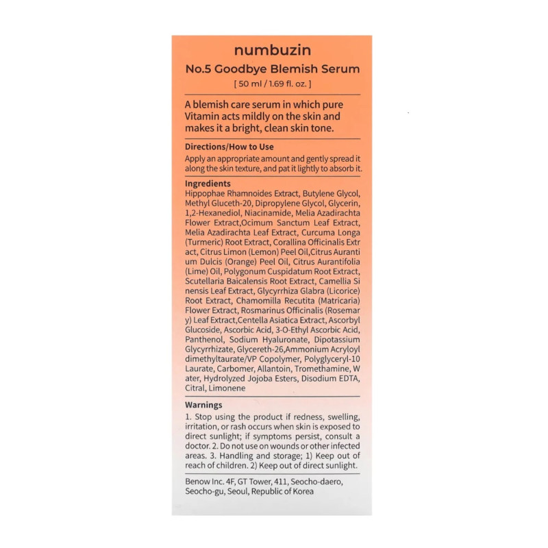 Позбавтеся від недоліків шкіри з корейською сироваткою Numbuzin No.5 Goodbye Blemish Serum — вашим новим союзником у боротьбі за чисту, здорову та сяючу шкіру.