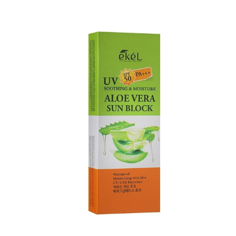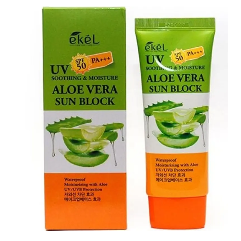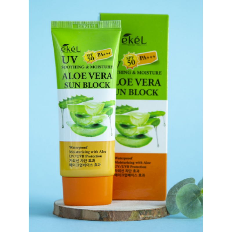 Крем Soothing & Moisture Aloe Vera Sun Block - це заспокійливий, зволожувальний та водостійкий сонцезахисний засіб на основі натуральних інгредієнтів, розроблений для всіх типів шкіри з високим рівнем SPF. Цей засіб майже не відчувається на шкірі, не залишає слідів та не псує макіяж. Завдяки формулі крем ефективно захищає від ультрафіолету, запобігає появі пігментації, фотостарінню, зморшкам та сухості. Крем добре зволожує і утримує вологу протягом дня, що сприяє відновленню шкіри та підтримки молодого вигляду. Крем потрібно застосовувати регулярно, тоді шкіра може уникнути сонячних опіків та зменшити ризик появи небажаної пігментації. В складі є екстракти алое вера та вітамін Е, вони заспокоюють та зволожують шкіру, сприяють швидкому загоєнню ран і зменшують почервоніння. Крем має легку структуру, яка швидко вбирається без залишків жирності та липкості. Засіб від EKEL має легкий приємний аромат і завдяки своєї водостійкості підходить для активностей та водних процедур.